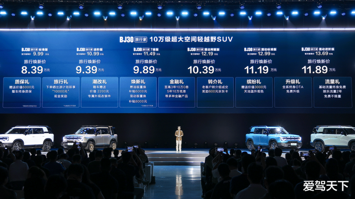 在这样的市场环境下,北京越野推出了BJ30旅行家,这是一款定位10万级轻越野SUV的新车,9月27日上市,一口气推出了6款车型,官方指导价9.99万-13.69万元。提供燃油和混动两种动力可选,其中混动版搭载1.5T涡轮增压发动机+电机的插混系统,综合功率301kW,综合扭矩685Nm,零百加速6.59秒,动力表现相当抢眼。